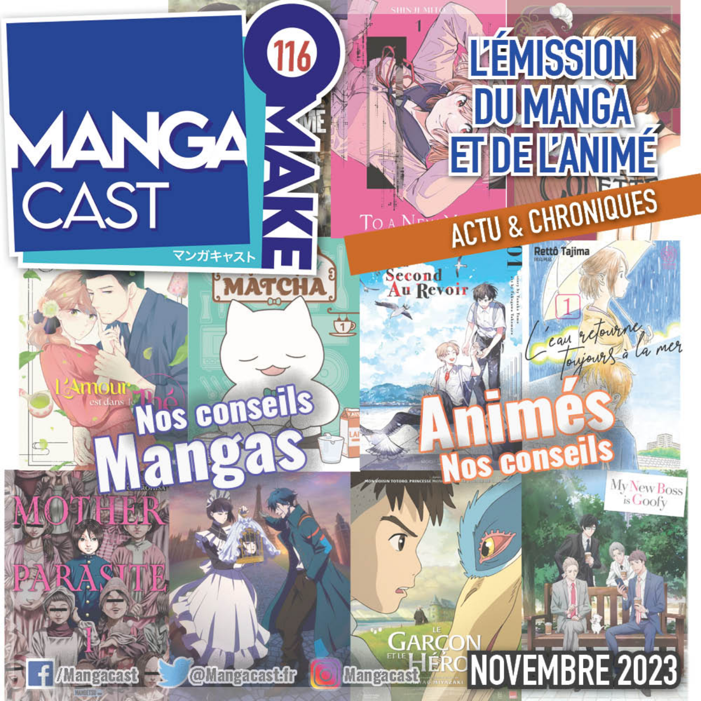Mangacast Omake n°116 : Novembre 2023 est présenté par Oshino, Echo, Gensen et Midine.
