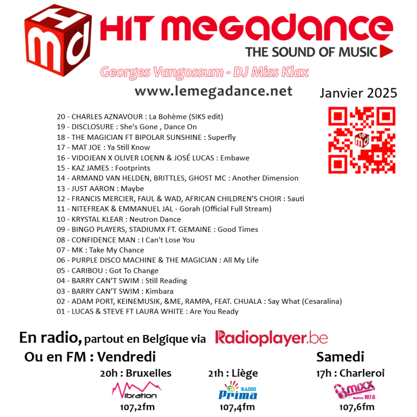 Le Hit Megadance, présenté par Georges Vangossum, est un classement de 20 titres mélangeant la House, l'EDM, la Nu Disco, la Pop dance ou simplement tous les genres musicaux de type électronique choisis par la team Megadance.
