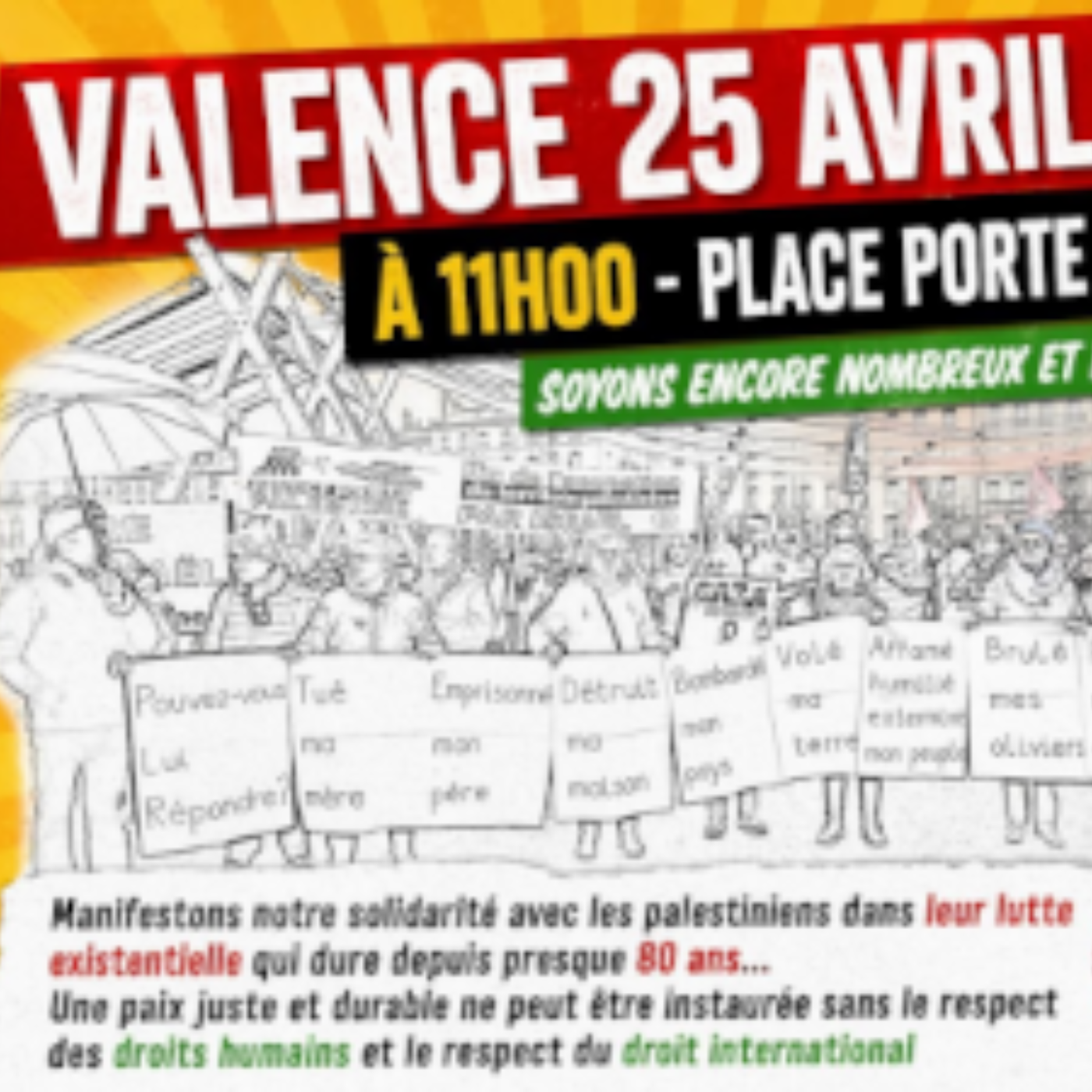 Manifestons notre solidarité avec les palestiniens dans leur lutte existentielle qui dure depuis presque 80 ans... Une paix juste et durable ne peut être instaurée sans le respect des droits humains et le respect du droit international.