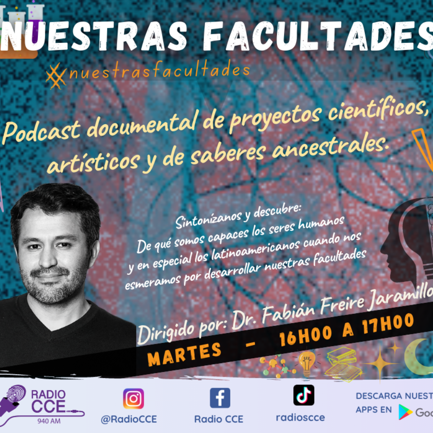 Nuestras Facultades es un podcast documental de proyectos científicos, artístico-culturales y de saberes ancestrales que busca descubrir de qué somos capaces los humanos, y en especial los latinoamericanos, cuando nos esmeramos por desarrollar nuestras facultades. Mediante un formato de entrevistas y observaciones de campo junto a investigadores, artistas y creadores nacionales e internacionales, Nuestras Facultades busca democratizar el conocimiento al sentir y saber ciudadano a través de la radio y medios públicos digitales–siempre desde un punto de vista humanista y práctico.